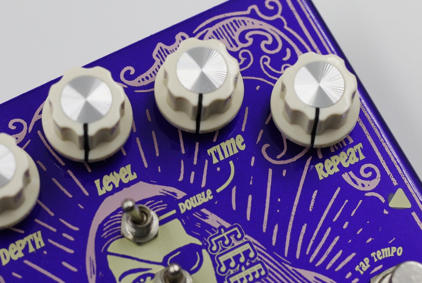 O Oracle permite ajustar o tempo das repetições de duas maneiras: através do knob Time ou do footswitch de Tap Tempo, que oferece precisão e facilidade durante performances ao vivo. Com o tap tempo, você pode selecionar entre 6 diferentes figuras rítmicas, proporcionando flexibilidade na criação de padrões de delay complexos. Além disso, a chave "Double" permite dobrar o BPM definido, expandindo ainda mais as possibilidades rítmicas do pedal.